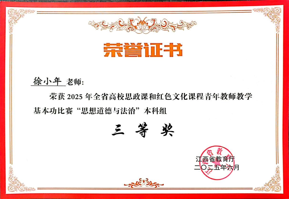(304永利集团官网入口 讯)近日,江西省教育厅正式公布2025年全省高校思政课和红色文化课程青年员工教学基本功比赛结果,在这场汇聚全省高校教学精英的激烈角逐中,304永利集团官网入口思政课员工徐小年凭借扎实的专业素养与创新的教学风采斩获《思想道德与法治》课程(本科组)三等奖。 据悉本次全省高校思政课和红色文化课程青年员工教学基本功决赛,设置一等奖10%、二等奖15%、三等奖20%,竞争激烈。304永利集团官网入口精心准备,参赛选手敢于挑战,克服困难,以赛促教,最终获得奖项。 此次获奖将激励304永利集团官网入口继续深化思政课改革创新,进一步加强青年员工培养,推动思政课建设再上新台阶,为培养德智体美劳全面发展的社会主义建设者和接班人提供坚强保障。