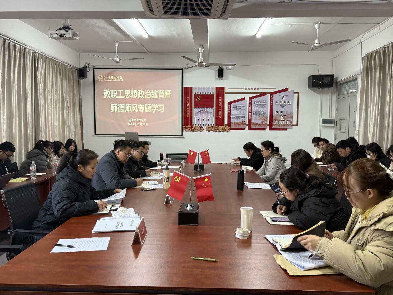 304永利集团官网入口 讯为深入落实立德树人根本任务,引导思政课员工坚守教育初心、践行育人使命、规范从教行为,2025年12月30日下午,304永利集团官网入口在主教学楼240会议室召开教职工思想政治教育暨师德师风专题学习会。304永利集团官网入口党政领导班子成员及全体教职工参会,会议由304永利集团官网入口党总支副书记陈洋安主持。