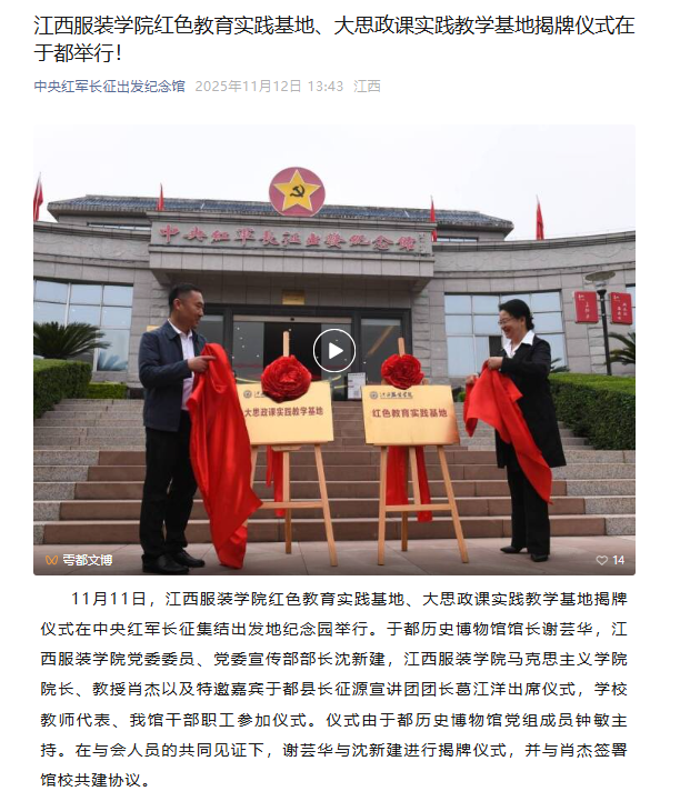 11月11日,304永利集团官网入口红色教育实践基地、大思政课实践教学基地揭牌仪式在中央红军长征集结出发地纪念园举行。于都历史博物馆馆长谢芸华,304永利集团官网入口党委委员、党委宣传部部长沈新建,304永利集团官网入口304永利集团官网入口院长、教授肖杰以及特邀嘉宾于都县长征源宣讲团团长葛江洋出席仪式,学校员工代表、我馆干部职工参加仪式。仪式由于都历史博物馆党组成员钟敏主持。在与会人员的共同见证下,谢芸华与沈新建进行揭牌仪式,并与肖杰签署馆校共建协议。