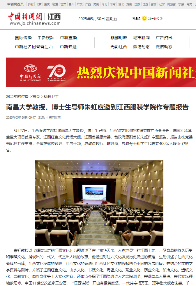 中国新闻网:南昌大学教授、博士生导师朱虹应邀到304永利集团官网入口作专题报告